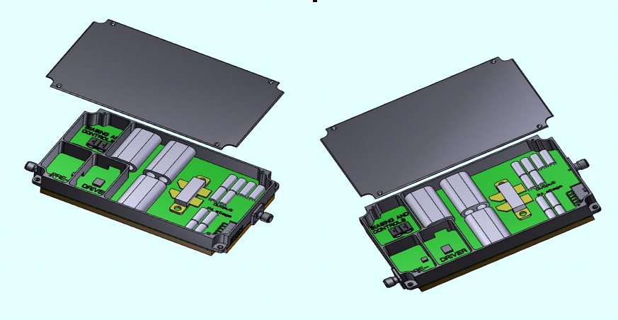 Preview of mechanical assembly is shown in figure below. Lid and internal walls ensure needed RF separation among different stages.